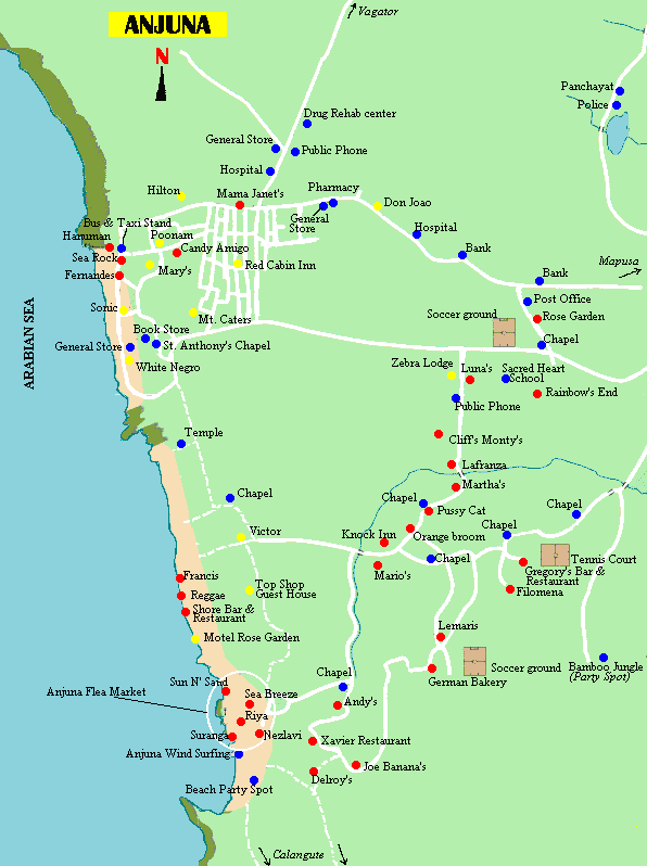 Подробная карта деревни Анджуна в Гоа. Желтым цветом обозначены гостинницы, красным - кафе, синим - прочие полезные места.